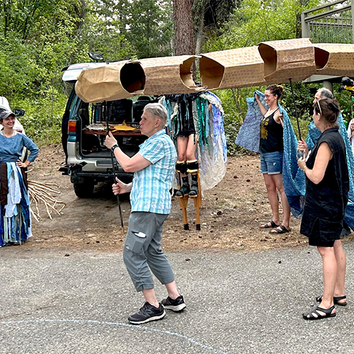 Day two – the workshop at Woodhaven Eco Culture Centre – hot dry air and the sweet smell of parched pine. Anona Kampe captivates us again with a Syilx creation story, introducing us to the four food chiefs of the Okanagan: Black Bear, Saskatoon Berry, Bitterroot and Salmon. The day is full with spoken word, films, poetry readings, discussions, and river-listening, including: Ronan Fraser, masters candidate UBCO's Coming from Further than Far Away; Dr Sharon Thesen, Professor Emerita, Creative Studies and Creative Writing UBC Okanagan reading from Oyama Pink Shale, and an inclusive participatory Festival of Riparian Puppets headed by Madi Donald and Annie Furman from UBC Okanagan.